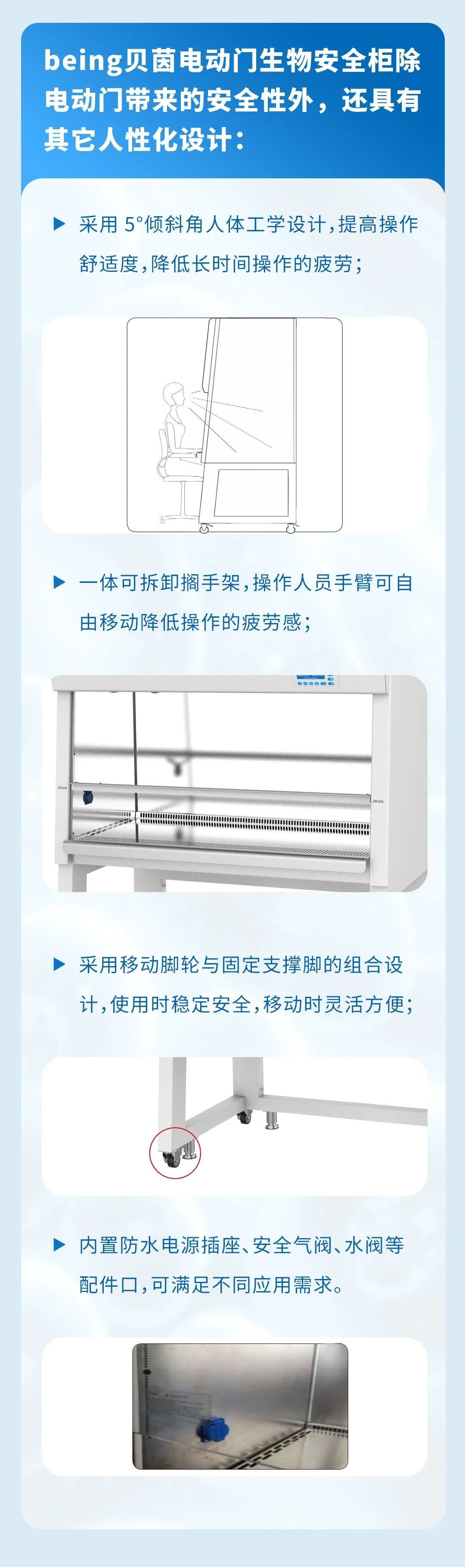 being貝茵生物安全(quán)櫃可進行電動門(mén)升級,前窗玻璃門通過電動升降來進行準確控製,還可以配置腳踏(tà)開關,直(zhí)接通過腳踏開關來控製電動門的升降。being貝茵電動門生物(wù)安全櫃可實現實(shí)驗過程中釋放操作者雙手,有效提高實(shí)驗人員工作效(xiào)率,同時避(bì)免實驗過程中兩(liǎng)人不同步可能帶來的生物安全隱患。