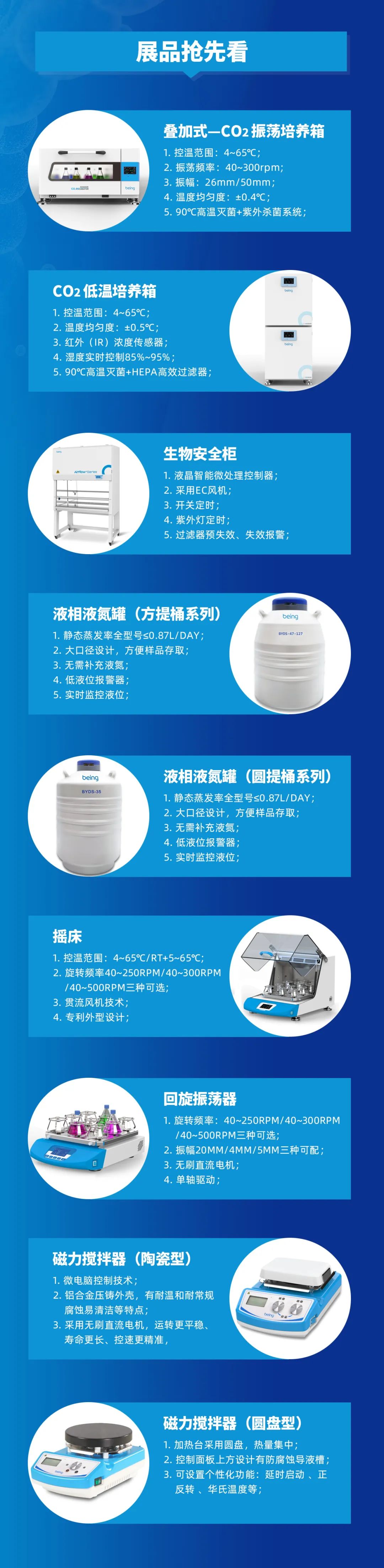 本次展會(huì),我們將精彩(cǎi)亮相B4-2712展位並現場(chǎng)展示低溫二氧化碳培養箱、生(shēng)物安全(quán)櫃、疊加二氧化碳振蕩培養箱、液氮罐、搖床、磁力攪(jiǎo)拌器等優質產(chǎn)品與專業解決方(fāng)案,期待與您的現場交流!