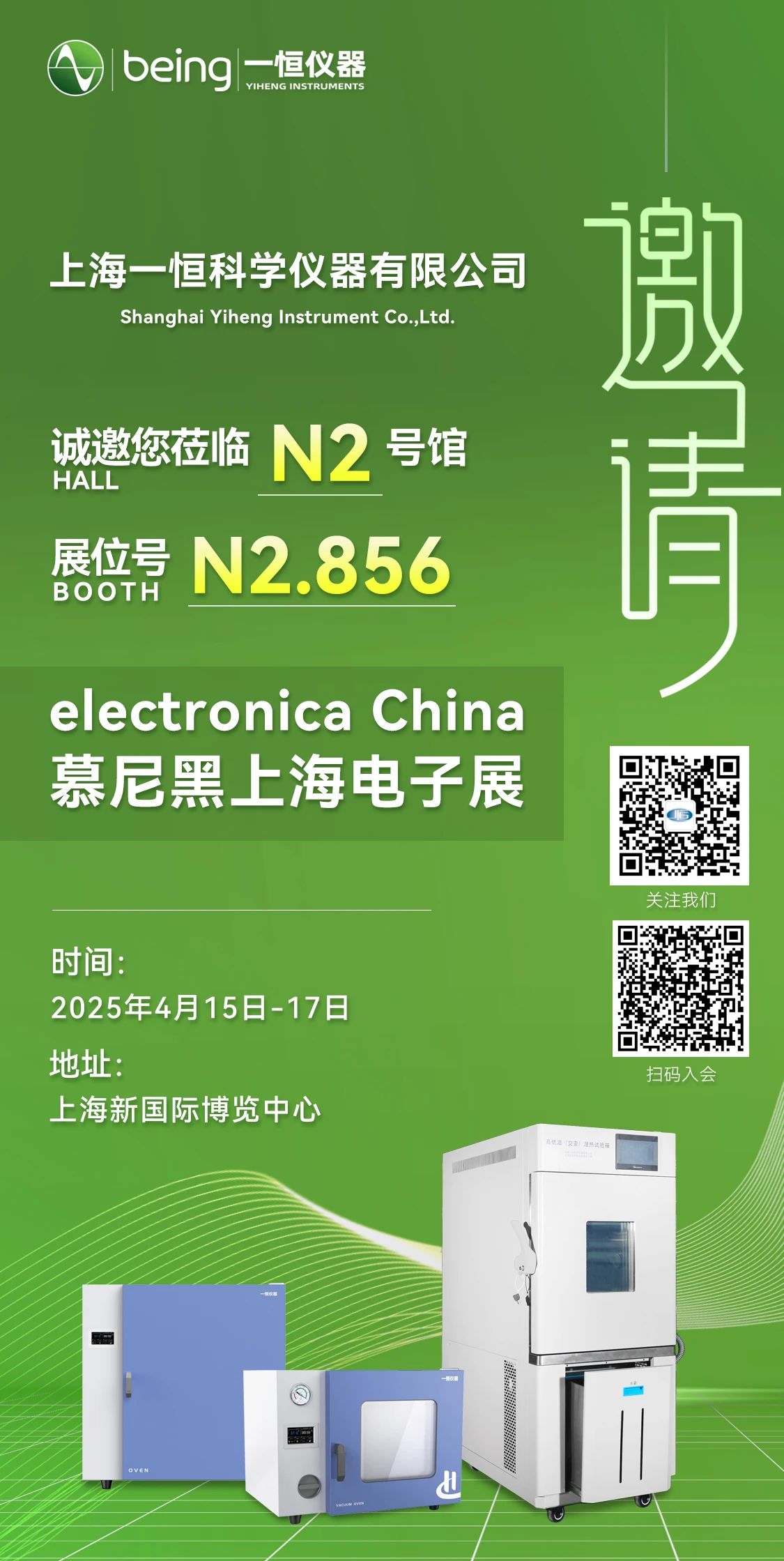 2025-04-08  |  文章來源:  |  點(diǎn)擊率: 一恒儀器誠邀您參加將於4月15-17日在上海新國際博覽中心舉辦的2025慕尼黑上海(hǎi)電子展。我們將在現場展示真(zhēn)空幹燥箱、鼓風幹燥(zào)箱、高低溫試驗箱等設備,展位號:N2.856,一恒儀器願成為您理想的實驗(yàn)室夥伴。